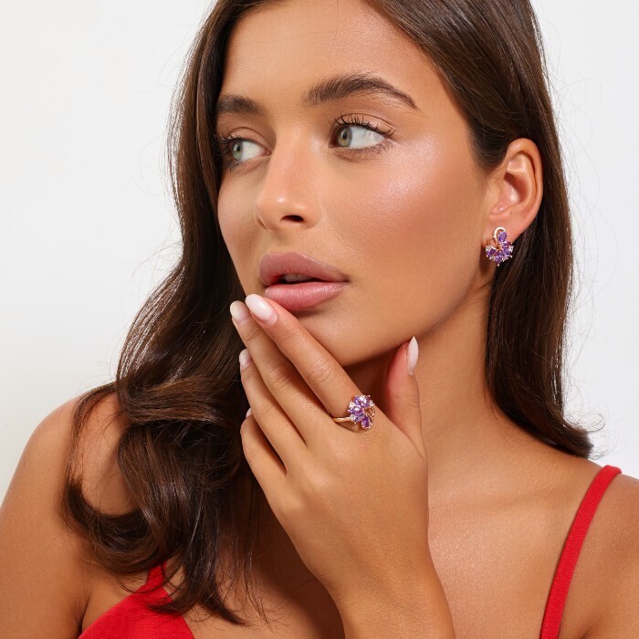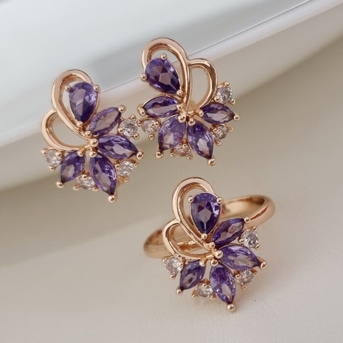 Комплект ювелирной бижутерии коллекция "Дубай" серьги и кольцо 16 р, покрытие позолота, вставка: фианиты, цвет: фиолетовый и прозрачный, арт.215.483-16 2 фото