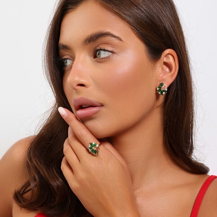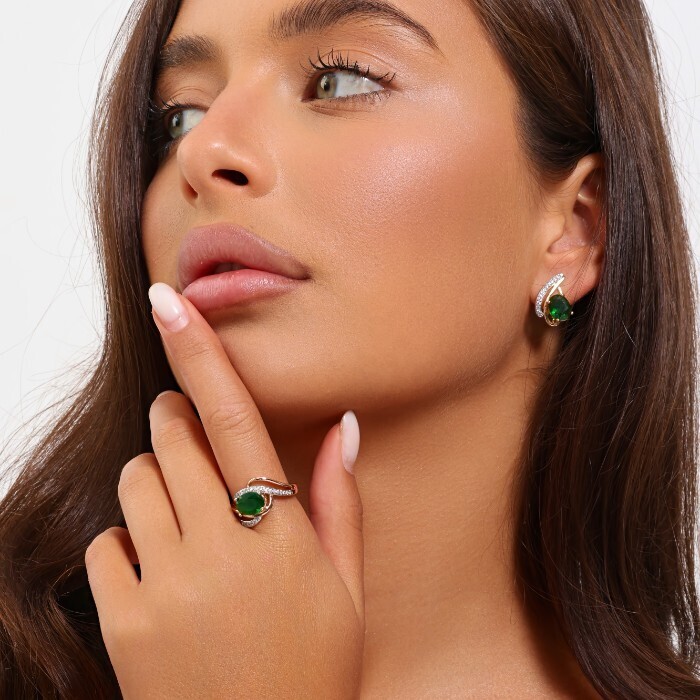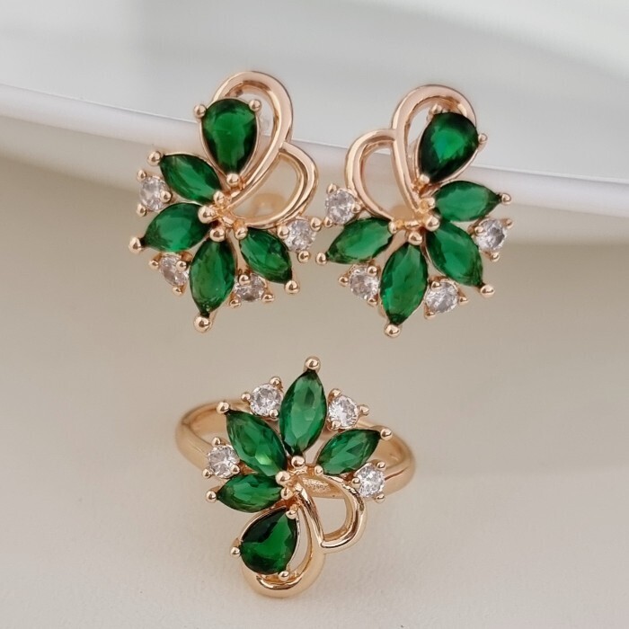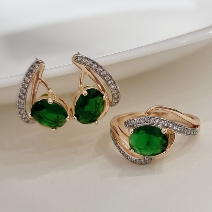 Комплект ювелирной бижутерии коллекция "Дубай" серьги и кольцо 17 р, покрытие позолота, вставка: фианиты, цвет: изумрудно-зеленый и прозрачный, арт.215.480-17 2 фото