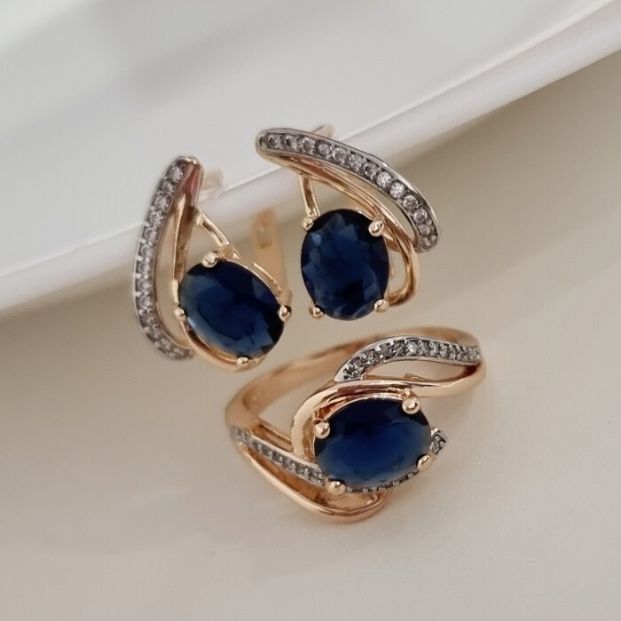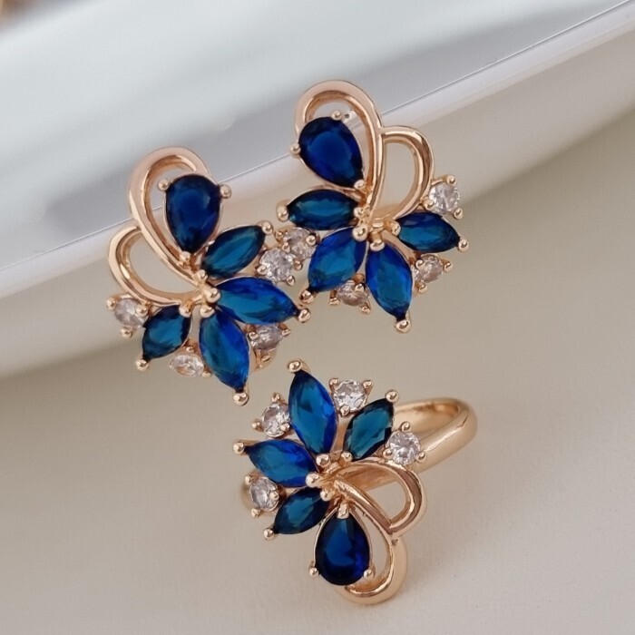 Комплект ювелирной бижутерии коллекция "Дубай" серьги и кольцо 18 р, покрытие позолота, вставка: фианиты, цвет: синий и прозрачный, арт.215.476-18 2 фото