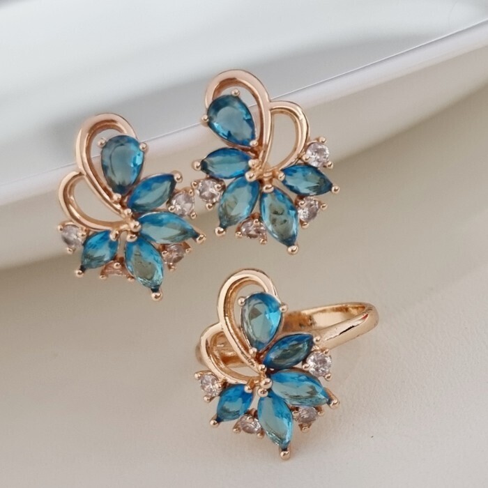 Комплект ювелирной бижутерии коллекция "Дубай" серьги и кольцо 17 р, покрытие позолота, вставка: фианиты, цвет: голубой и прозрачный, арт.215.481-17 2 фото