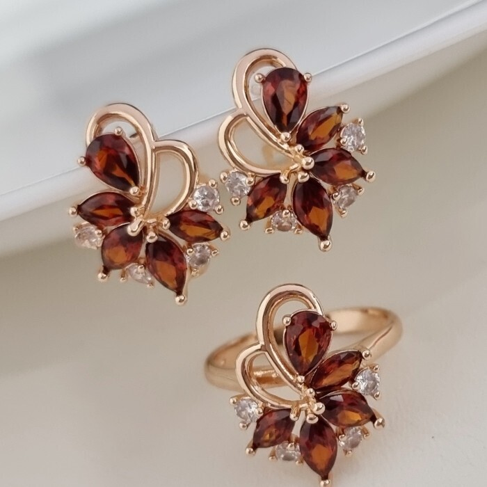 Комплект ювелирной бижутерии коллекция "Дубай" серьги и кольцо 17 р, покрытие позолота, вставка: фианиты, цвет: оранжево-красный и прозрачный, арт.215.478-17 2 фото