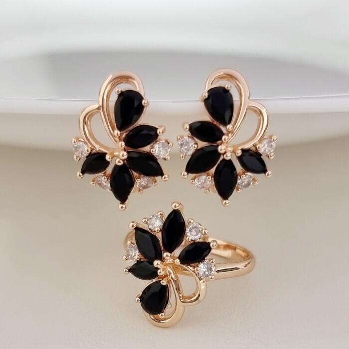 Комплект ювелирной бижутерии коллекция "Дубай" серьги и кольцо 17 р, покрытие позолота, вставка: фианиты, цвет: черный и прозрачный, арт.215.477-17 2 фото