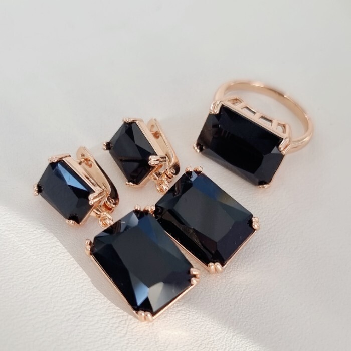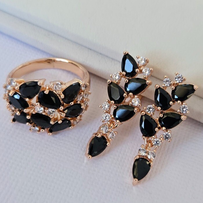 Комплект ювелирная бижутерия коллекция  "Дубай" серьги и кольцо 18 р, покрытие: позолота, вставка: фианиты, цвет: черный, арт.313.139-18 2 фото