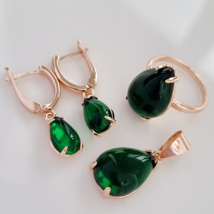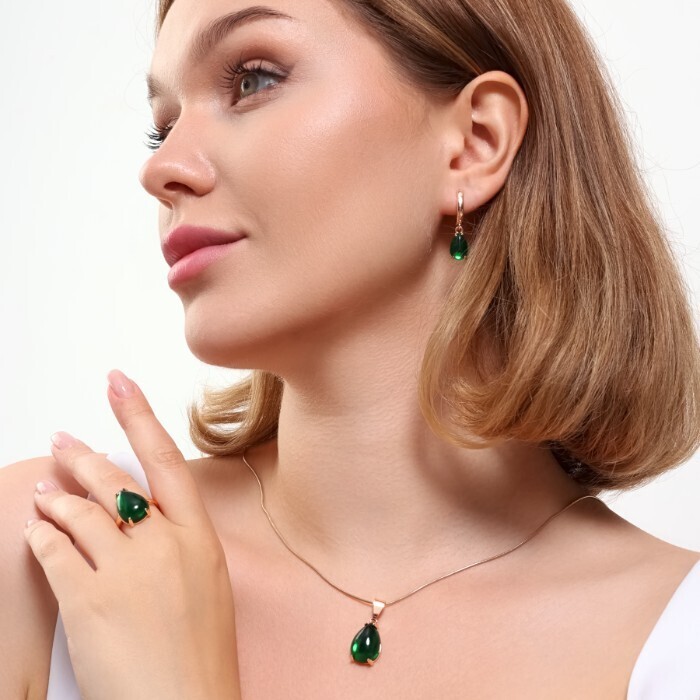 Комплект ювелирная бижутерия коллекция  "Дубай" серьги, кулон и кольцо 21 р, покрытие: позолота, вставка: пластик, цвет: зеленый, арт.215.418-21 2 фото