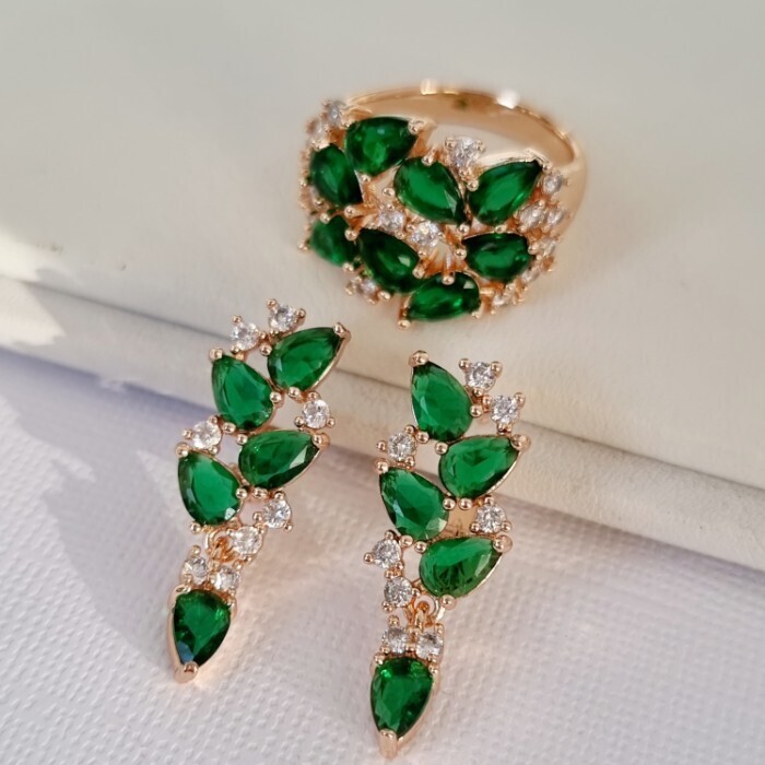 Комплект ювелирная бижутерия коллекция  "Дубай" серьги и кольцо 20 р, покрытие: позолота, вставка: фианиты, цвет: изумрудный и прозрачный, арт.313.044-20