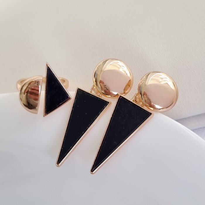 Комплект ювелирная бижутерия коллекция  "Дубай" серьги и кольцо разъемное 17-18 р, покрытие: позолота, вставка: пластик, цвет: черный, арт.313.052-17-18