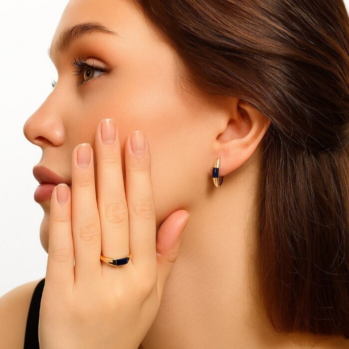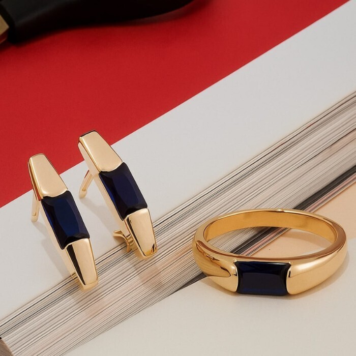Комплект украшений ювелирная бижутерия Дубайское золото серьги и кольцо 17 р, покрытие позолота, вставка: фианит, цвет: синий, арт.215.233-17,5 2 фото