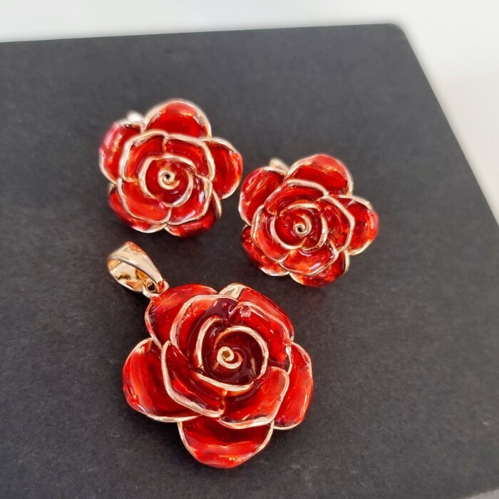 Комплект ювелирная бижутерия коллекция  "Дубай" серьги и кулон, покрытие: позолота, вставка: цветная витражная эмаль красного цвета, арт.313.050
