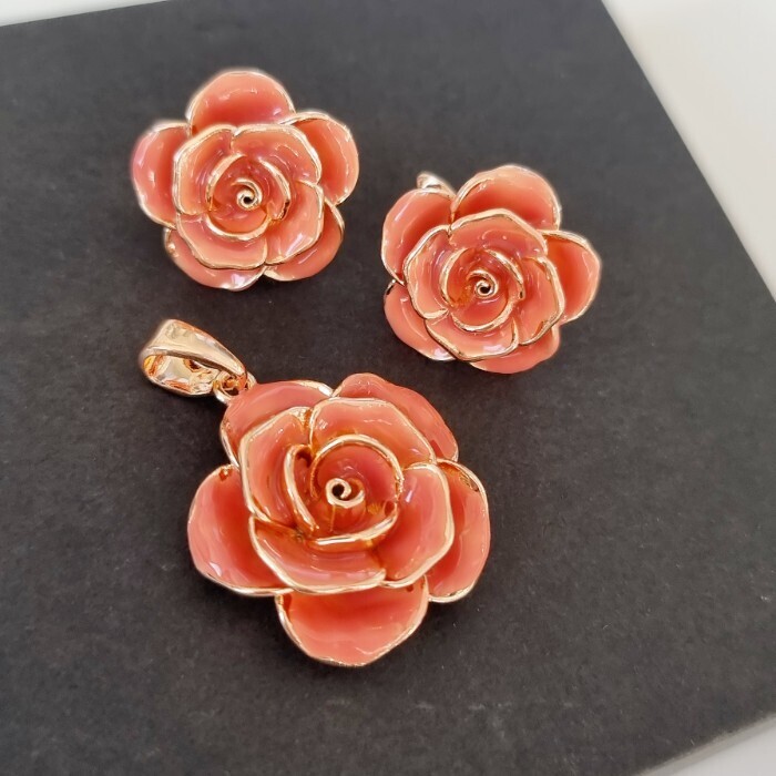Комплект ювелирная бижутерия коллекция  "Дубай" серьги и кулон, покрытие: позолота, вставка: цветная витражная эмаль розового цвета, арт.313.049