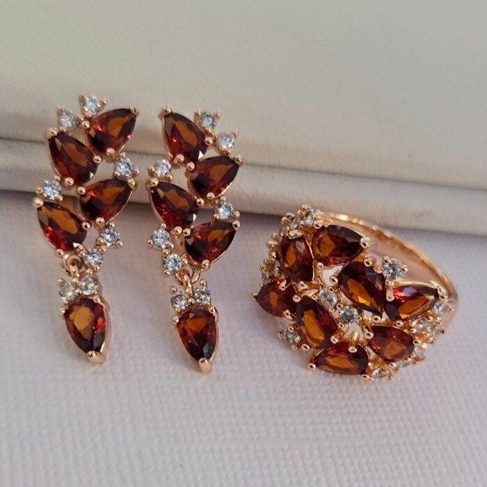 Комплект ювелирная бижутерия коллекция  "Дубай" серьги и кольцо 20 р, покрытие: позолота, вставка: фианиты, цвет: оранжево-красный и прозрачный, арт.313.047-20
