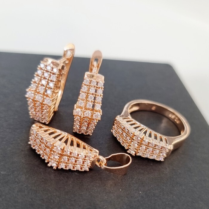 Комплект ювелирная бижутерия коллекция  "Дубай" серьги, кулон и кольцо 17 р, покрытие: позолота, вставка: фианиты, цвет: прозрачный, арт.313.053-17