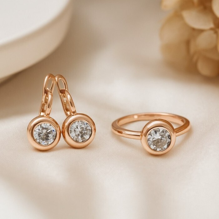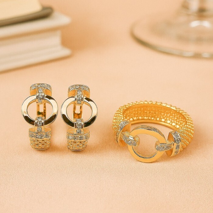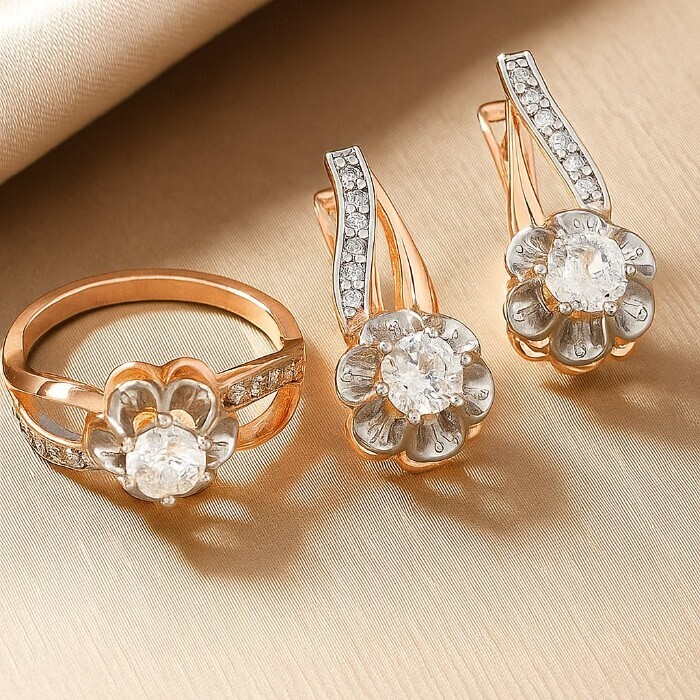 Комплект ювелирной бижутерии коллекция "Дубай" серьги и кольцо 18 р, покрытие позолота,  вставка: фианиты, цвет: прозрачный, арт.217.375-18 2 фото