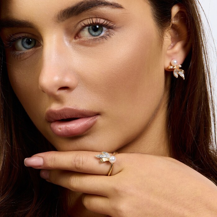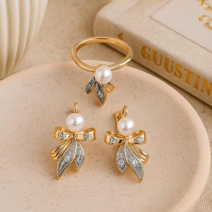 Комплект ювелирной бижутерии коллекция "Дубай" серьги и кольцо 18 р, покрытие позолота,  вставка: фианиты и искусственный жемчуг, цвет: прозрачный и жемчужный, арт.217.370-18 2 фото
