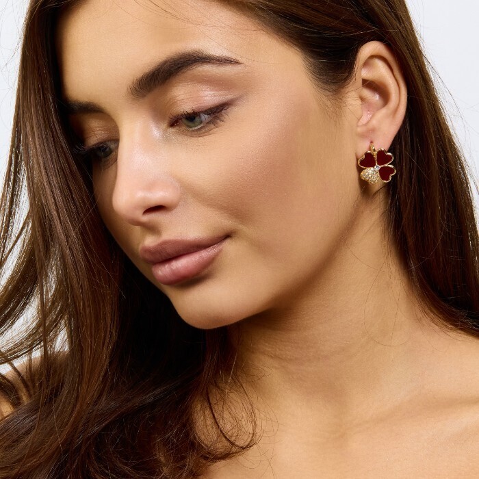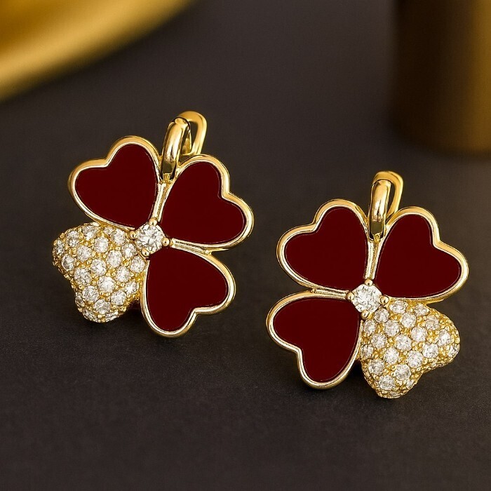 Серьги клевер ювелирная бижутерия Итальянское золото (покрытие желтое 14к), вставка: фианиты и пластик, цвет: прозрачный и бордовый, арт.217.425 2 фото