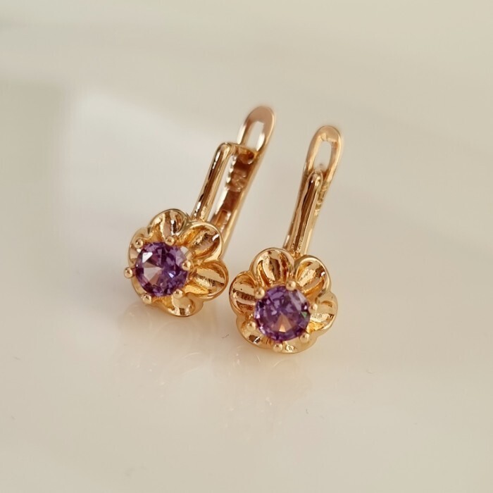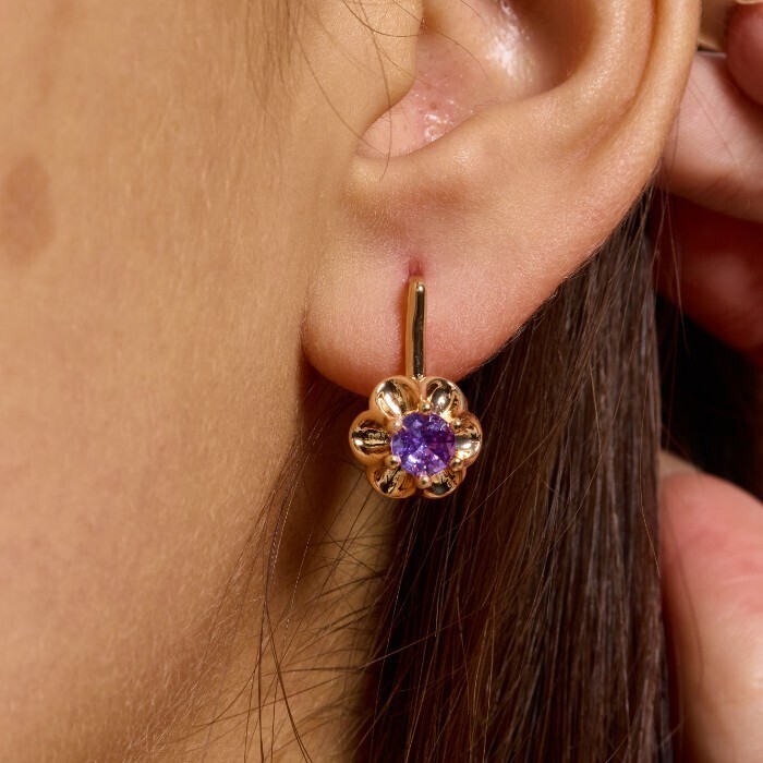 Серьги цветы ювелирная бижутерия коллекция "Дубай", покрытие позолота,  вставка: фианит, цвет: фиолетовый, арт.217.439 2 фото