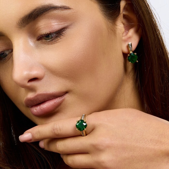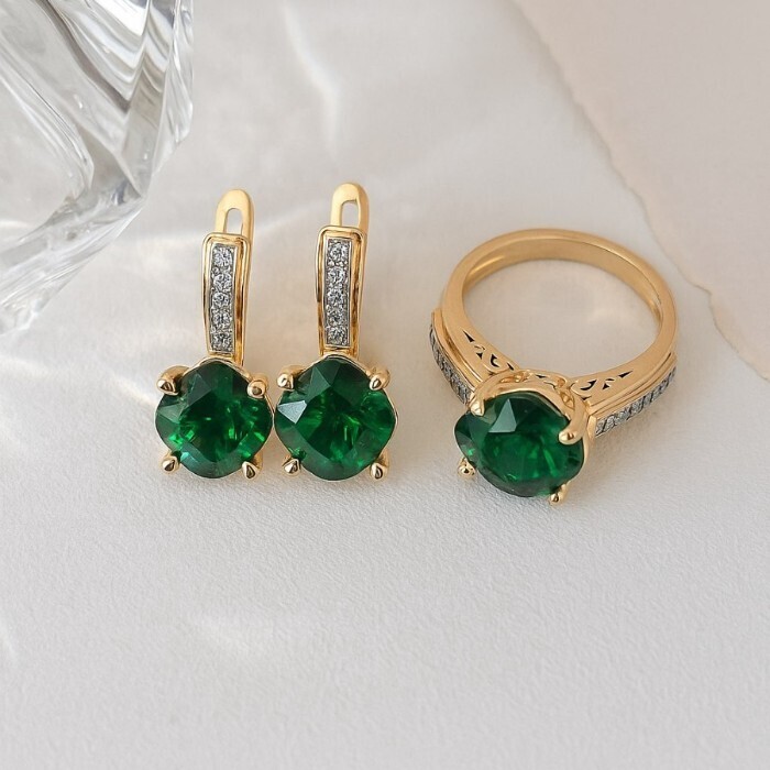 Комплект ювелирной бижутерии Итальянское золото (покрытие желтое 14к) серьги и кольцо 20 р, вставка: фианиты и цирконы, цвет: зеленый и прозрачный, арт.217.384-20 2 фото