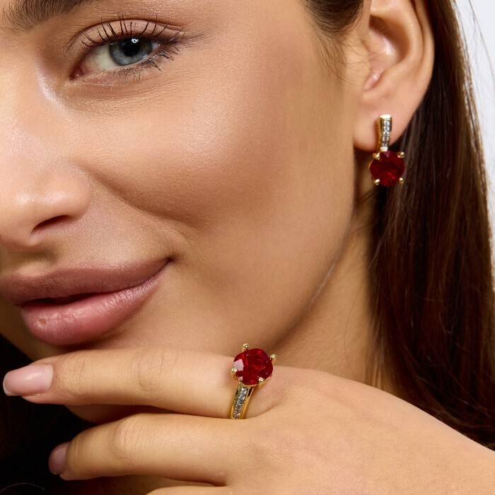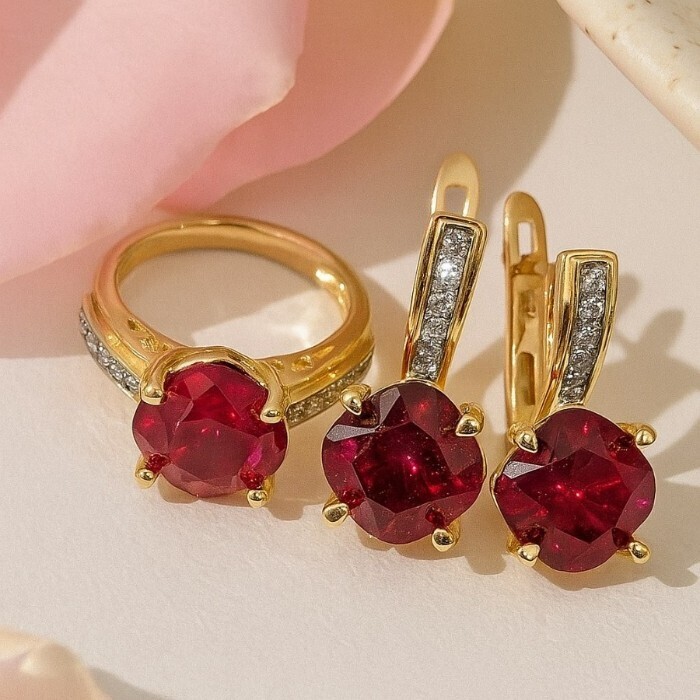 Комплект ювелирной бижутерии Итальянское золото (покрытие желтое 14к) серьги и кольцо 18 р, вставка: фианиты и цирконы, цвет: красный и прозрачный, арт.217.382-18 2 фото