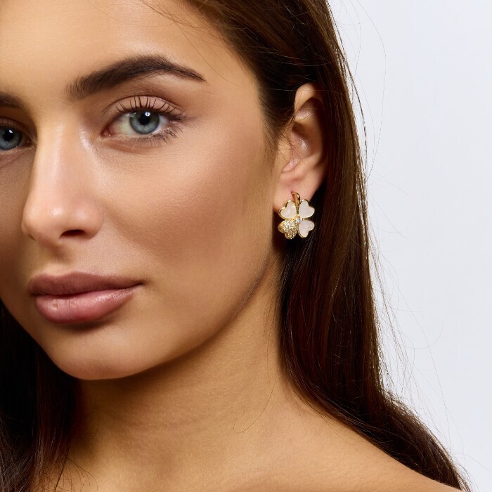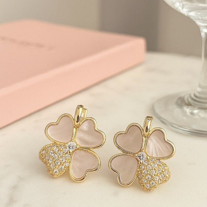 Серьги клевер ювелирная бижутерия Итальянское золото (покрытие желтое 14к), вставка: фианиты и пластик, цвет: прозрачный и перламутровый, арт.217.427 2 фото