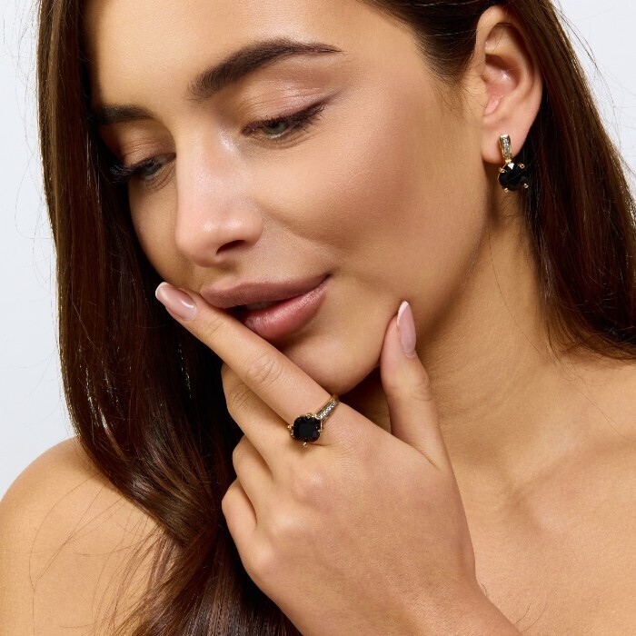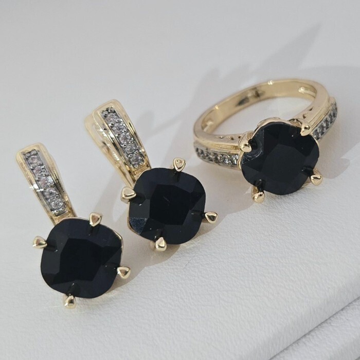 Комплект ювелирной бижутерии Итальянское золото (покрытие желтое 14к) серьги и кольцо 20 р, вставка: фианиты и цирконы, цвет: черный и прозрачный, арт.217.383-20 2 фото