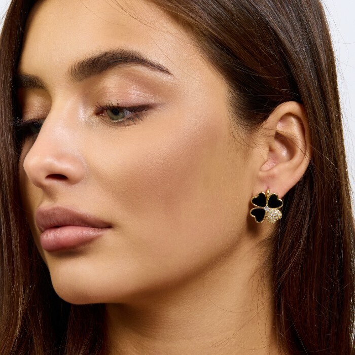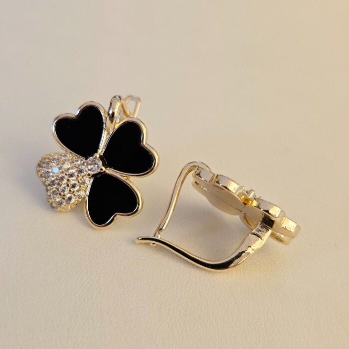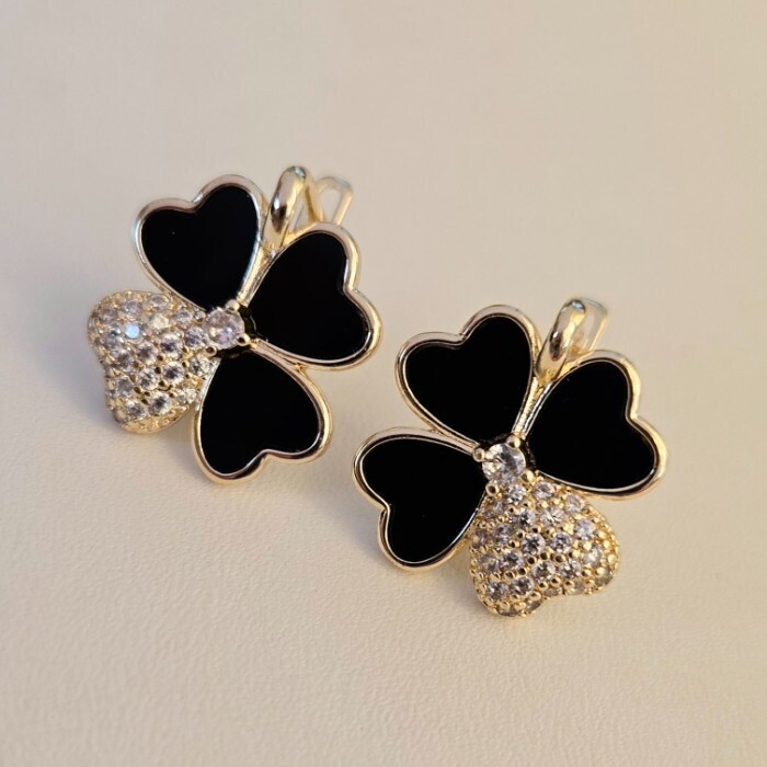 Серьги клевер ювелирная бижутерия Итальянское золото (покрытие желтое 14к), вставка: фианиты и пластик, цвет: прозрачный и черный, арт.217.426 3 фото