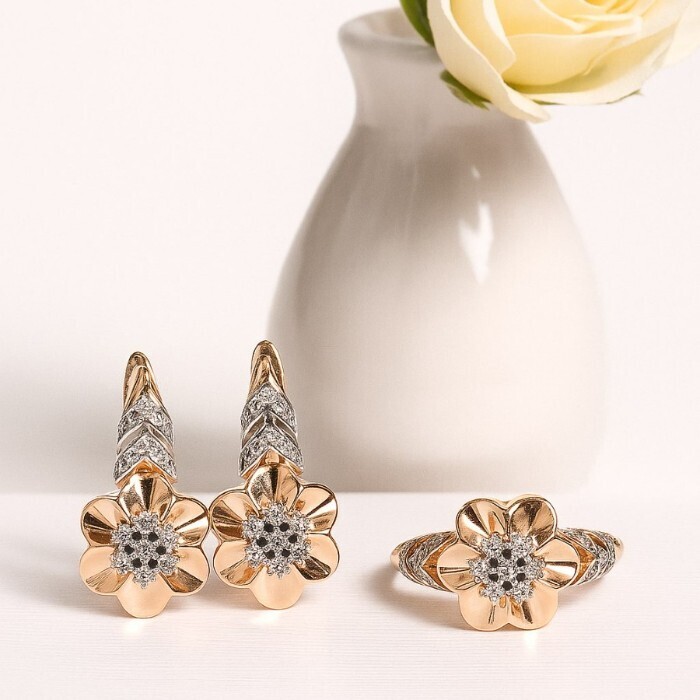 Комплект ювелирной бижутерии Итальянское золото (покрытие желтое 14к) серьги и кольцо 18 р, вставка: фианиты и цирконы, цвет: черный и прозрачный, арт.217.383-18 2 фото