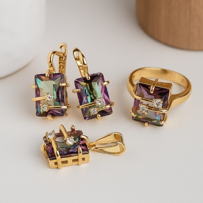 Комплект ювелирной бижутерии коллекция "Дубай" серьги, кулон и кольцо 19 р, покрытие позолота,  вставка: фианиты и цирконы, цвет: хамелеон и прозрачный, арт.217.367-19 2 фото