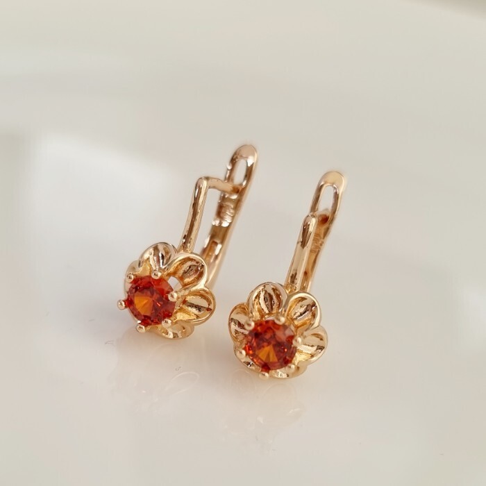Серьги цветы ювелирная бижутерия коллекция "Дубай", покрытие позолота,  вставка: фианит, цвет: оранжево-красный, арт.217.438 2 фото