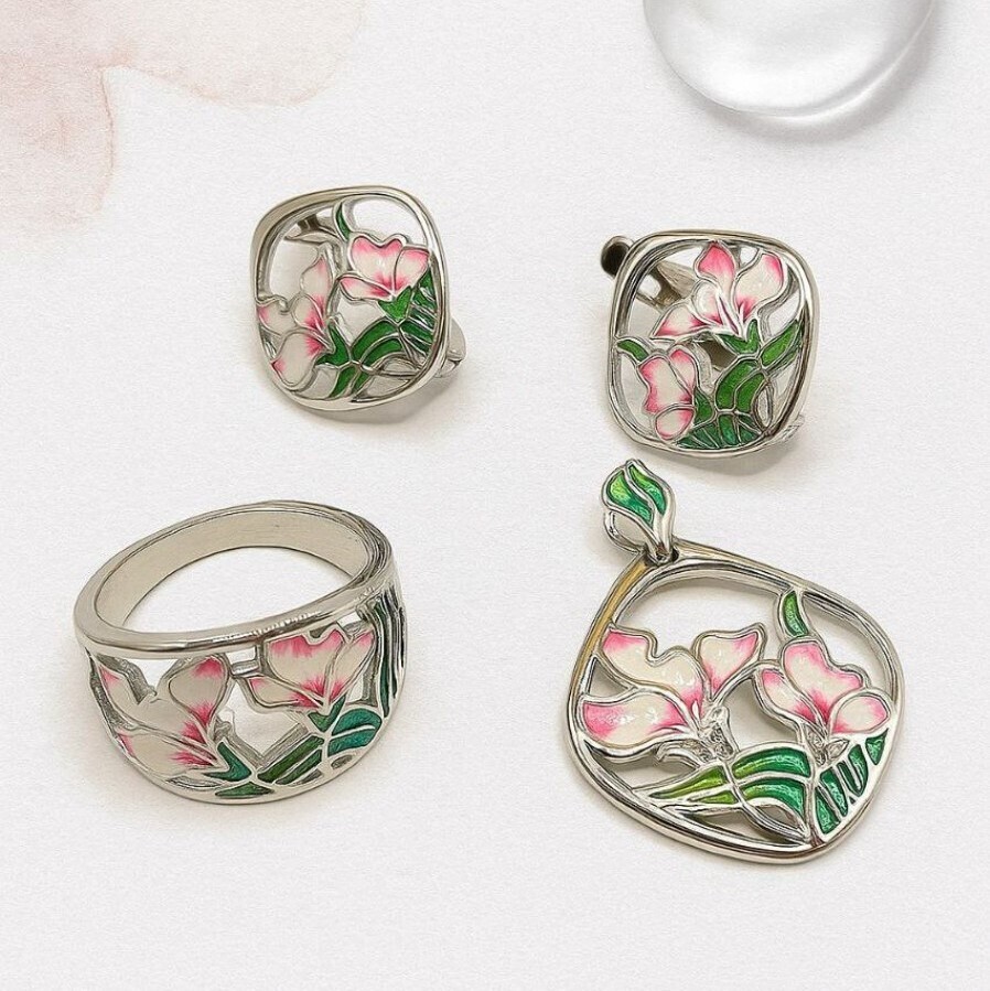 Комплект ювелирная бижутерия коллекция  "Дубай" серьги, кулон и кольцо 19 р, покрытие: посеребрение, вставка: цветная эмаль и цирконы, арт.313.273-19 2 фото