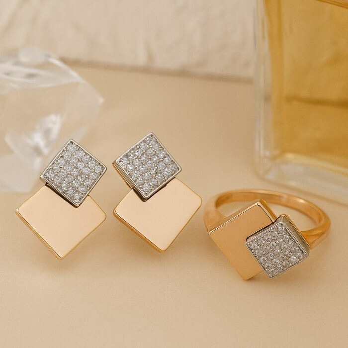 Комплект ювелирной бижутерии коллекция "Дубай" серьги и кольцо 17 р, покрытие позолота, вставка: фианиты, цвет: прозрачный, арт.217.371-17 2 фото