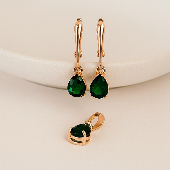 Комплект ювелирной бижутерии коллекция "Дубай" серьги и кулон, покрытие позолота, вставка: фианиты, цвет: зеленый, арт.414.032