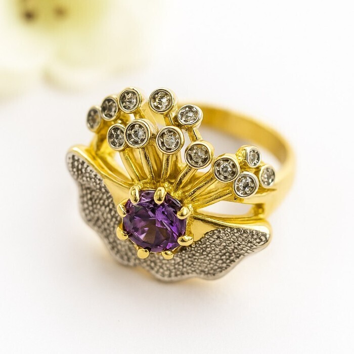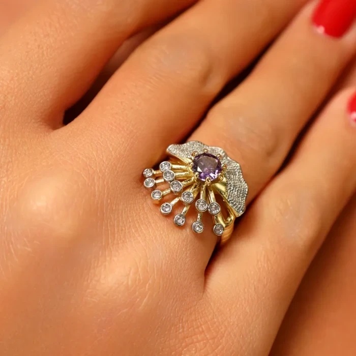 Кольцо 17 р ювелирная бижутерия Итальянское золото (покрытие желтое 14к), вставка: фианиты, цвет: прозрачный и фиолетовый, арт.313.379-17 2 фото