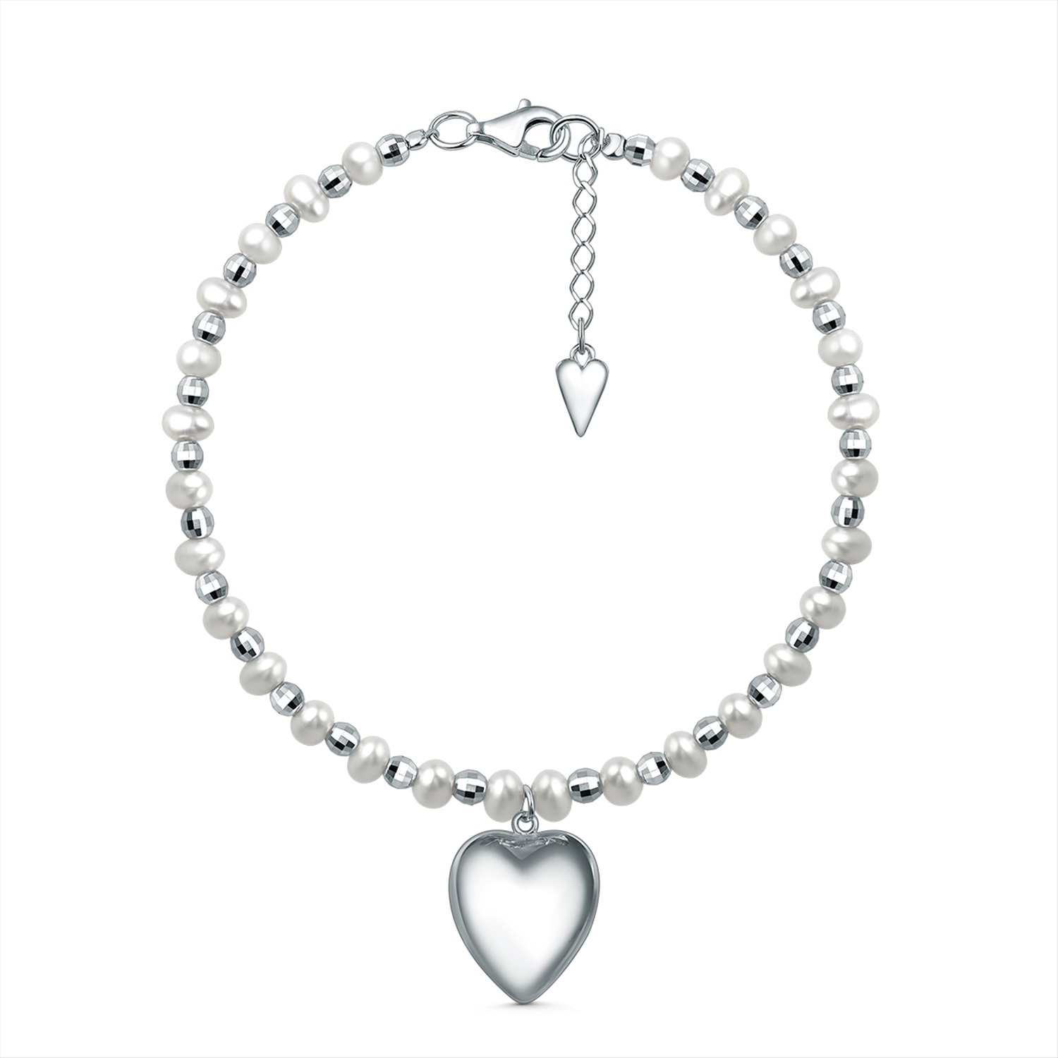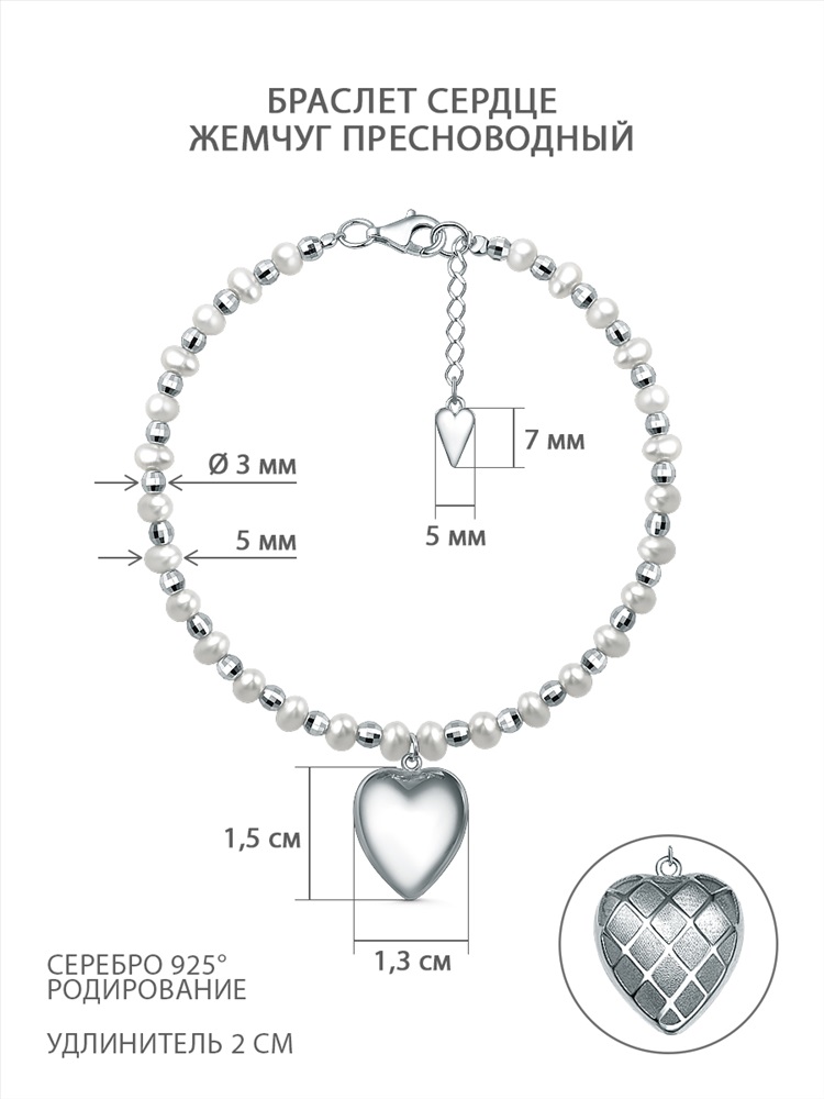 Браслет из серебра с пресноводным культивированным жемчугом родированный - Сердце, 19 см 251-10-293-19р 2 фото