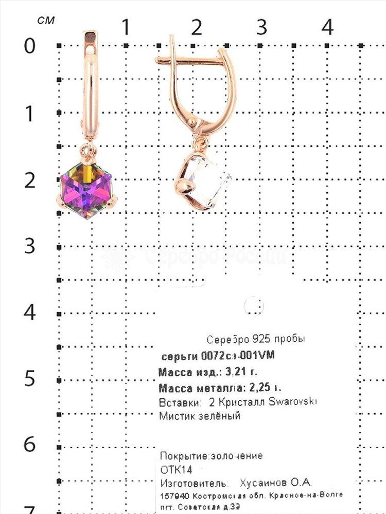 Серьги из золочёного серебра с кристаллами Swarovski Мистик зелёный 925 пробы 0072сз-001VM 3 фото