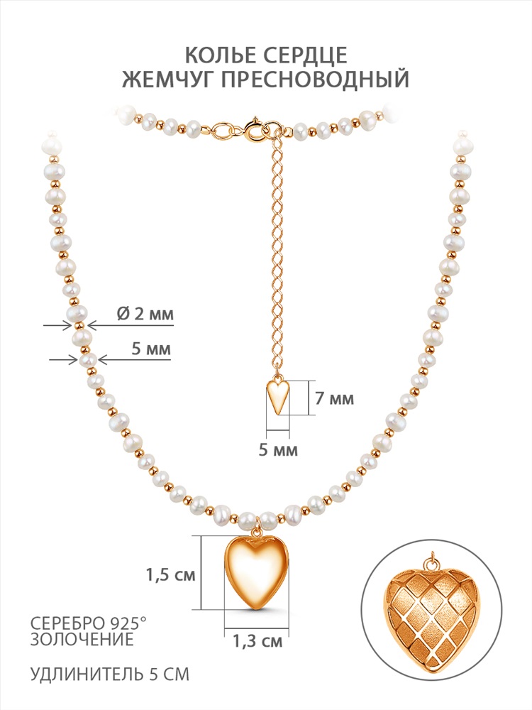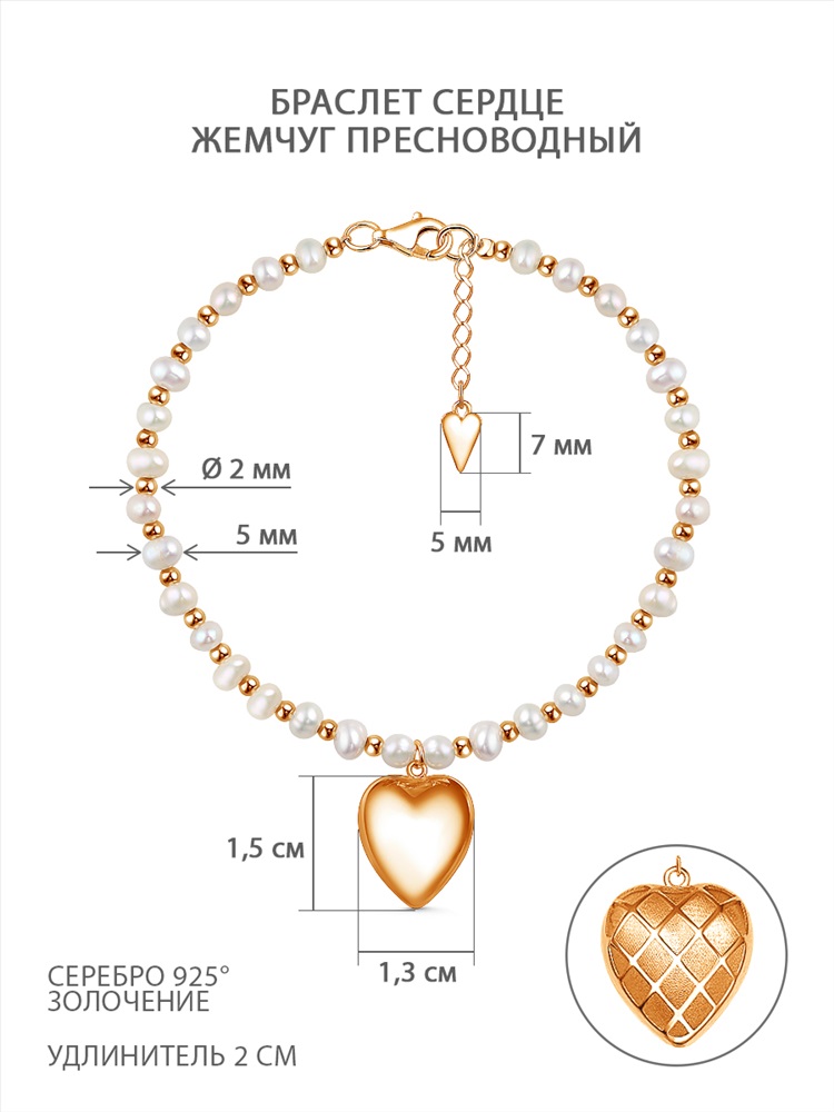 Браслет из золочёного серебра с пресноводным культивированным жемчугом - Сердце 251-20-211-19з 2 фото
