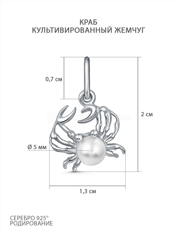 Подвеска из серебра с культивированным жемчугом родированная - Краб П-2382-Р 2 фото