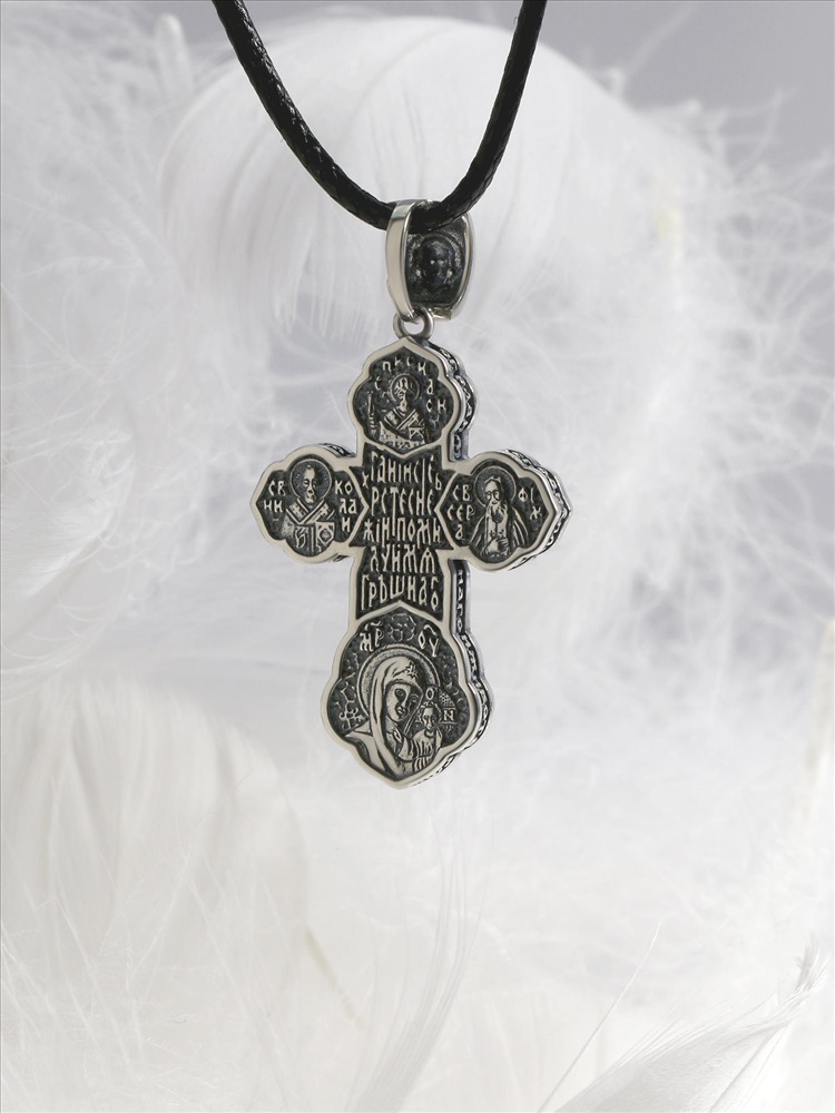 Крест православный из чернёного серебра - Спас Нерукотворный, Казанская Божья Матерь, молитва ко Пресвятой Троице, Святая Троица, 4 см КР-2041о 2 фото