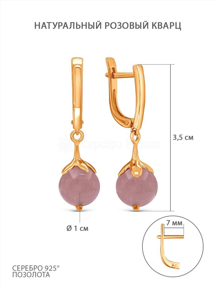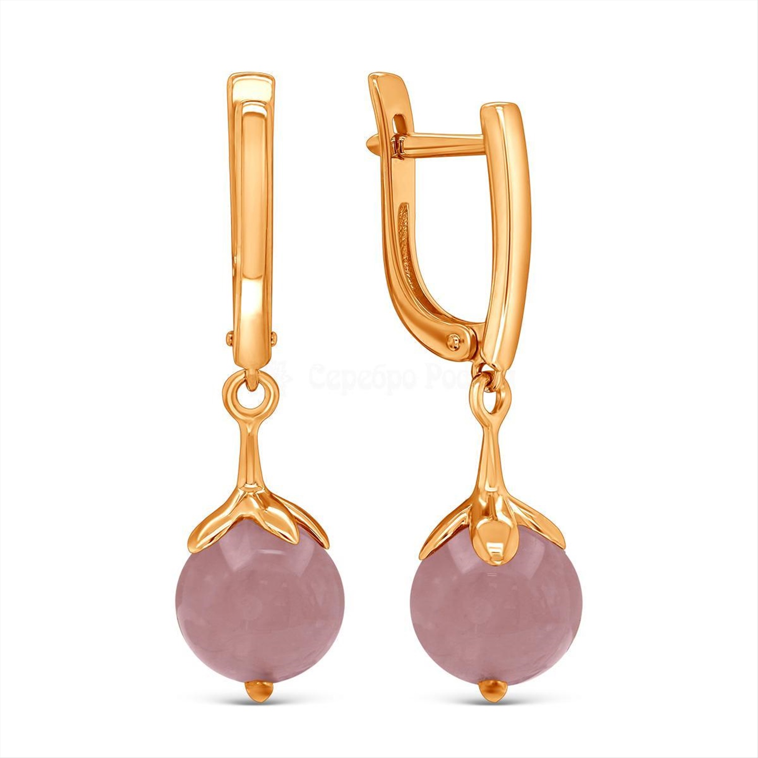 Серьги из золочёного серебра с нат. кварцем розовый шар 925 пробы с-2287зк421 2 фото