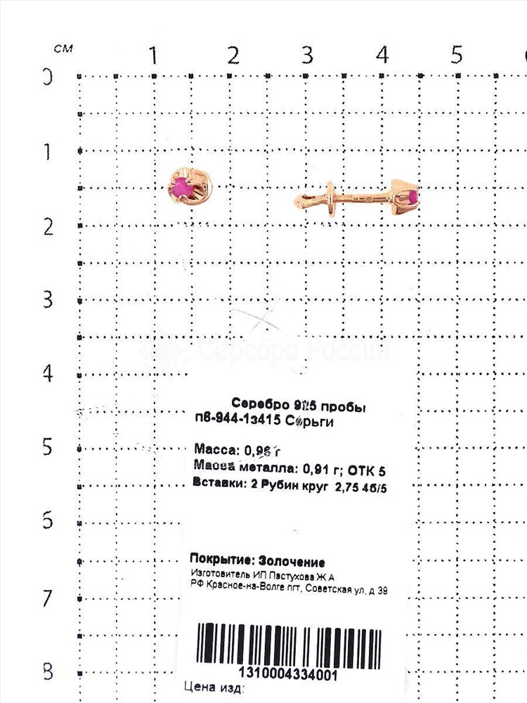 Серьги-пусеты из золочёного серебра с нат. рубином 925 пробы п6-944-1з915 2 фото