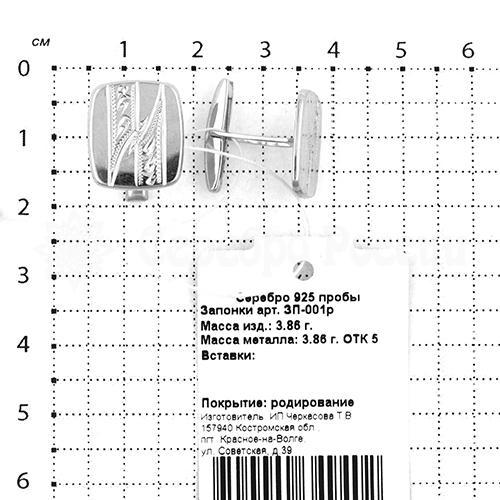 Запонки из серебра родированные 080019 6 фото