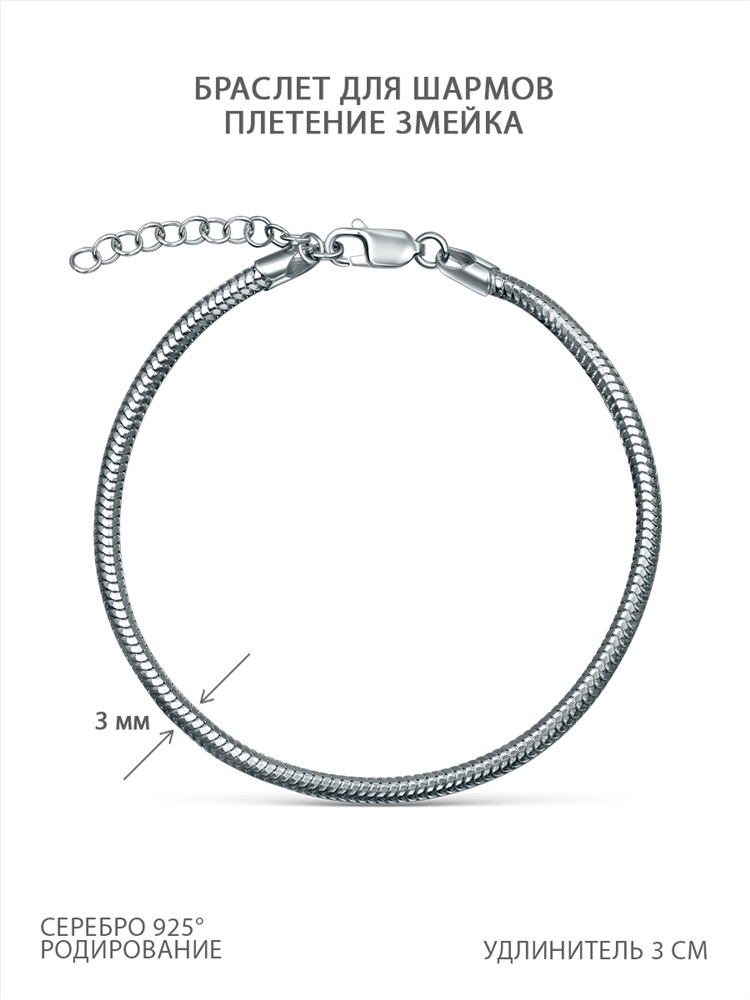 Браслет для шармов из серебра родированный - Плетение змейка, 19 см 2108R300L19+ 2 фото