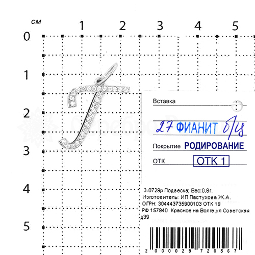 Подвеска-буква из серебра с фианитами родированная 925 пробы 3-0729р 2 фото