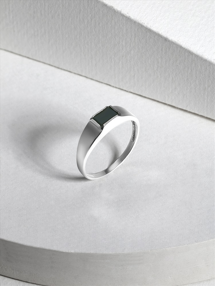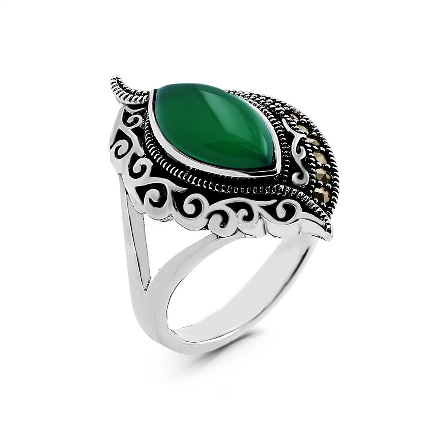 Кольцо из чернёного серебра с нат. зеленым агатом и марказитами 925 пробы HR-1426а
