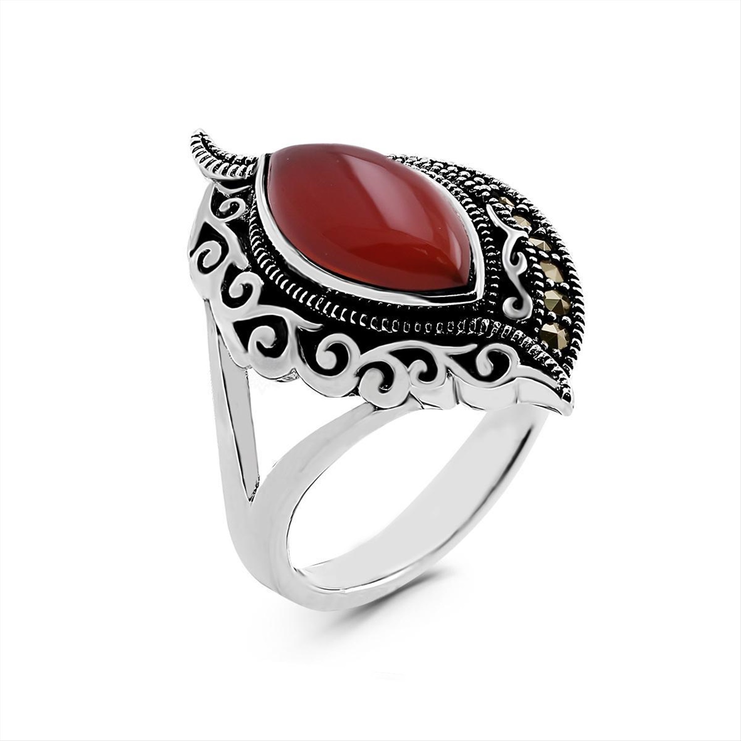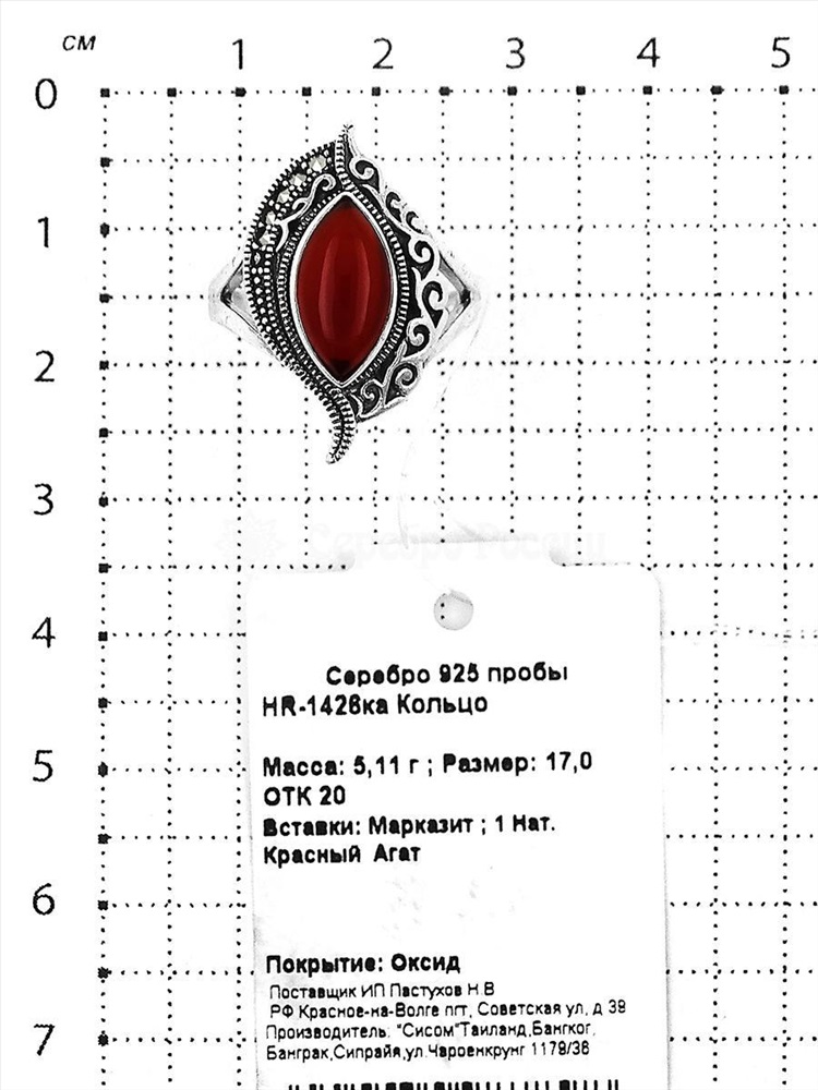 Кольцо из чернёного серебра с нат. красным агатом и марказитами 925 пробы HR-1426ка 2 фото
