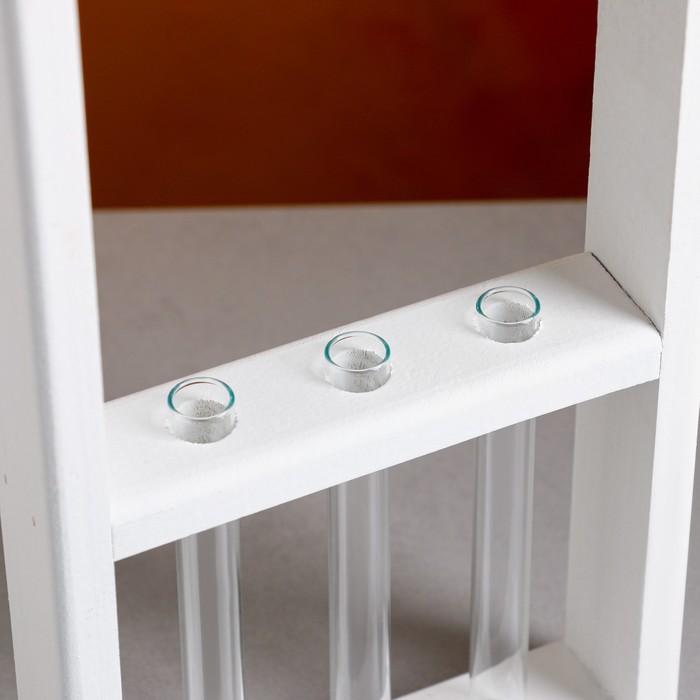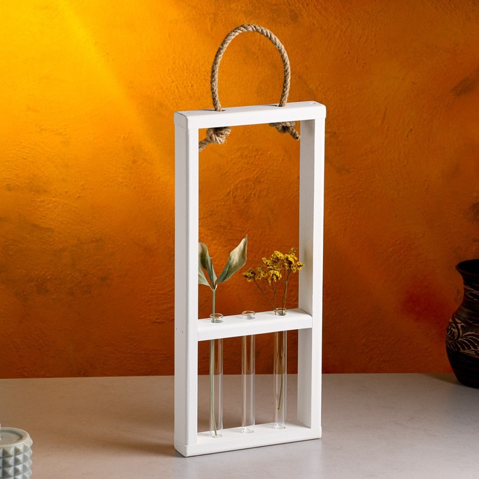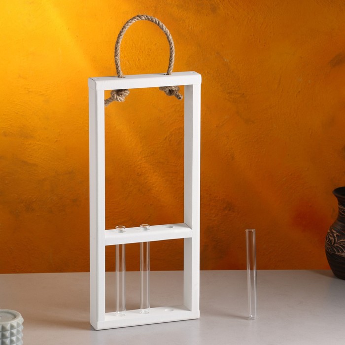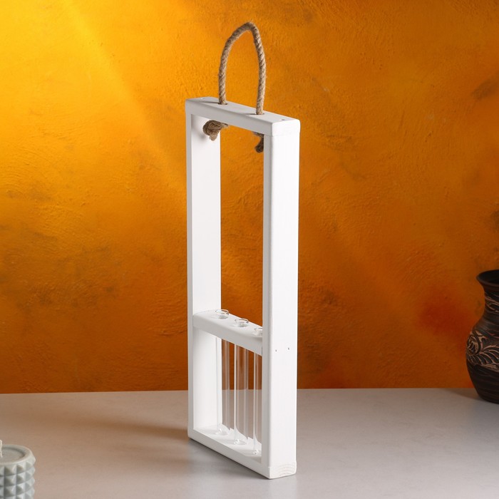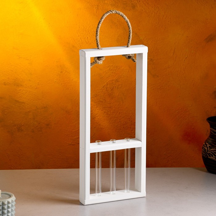 Кашпо деревянное, 18×5×40 см, 3 колбы, ручка - верёвка, белое 6 фото