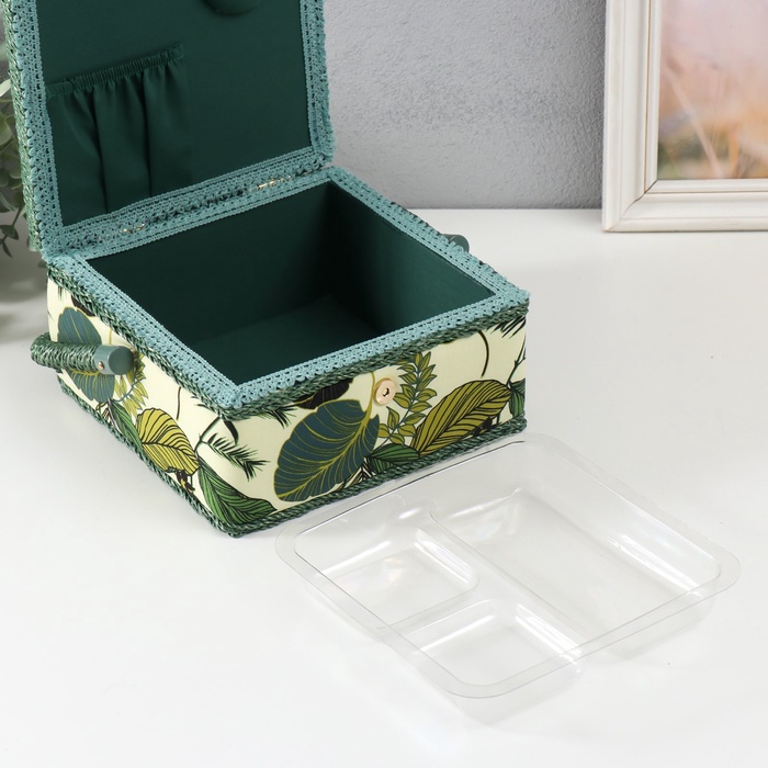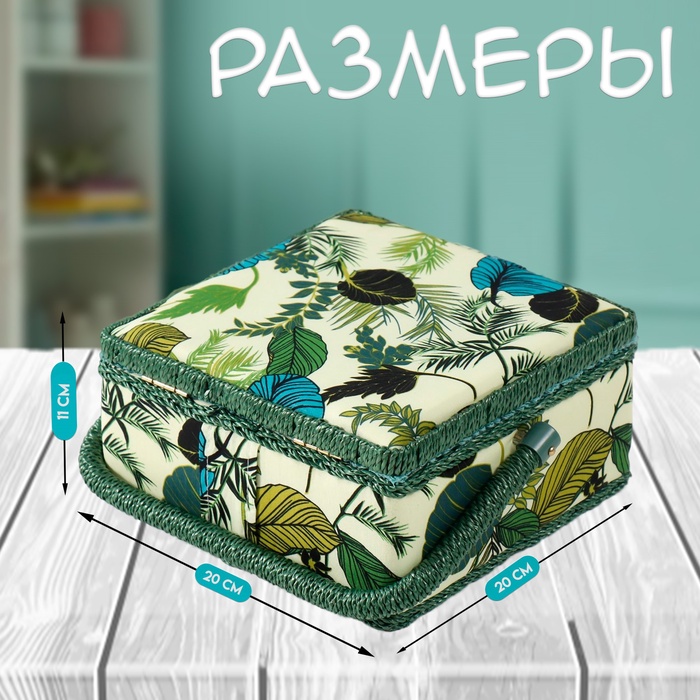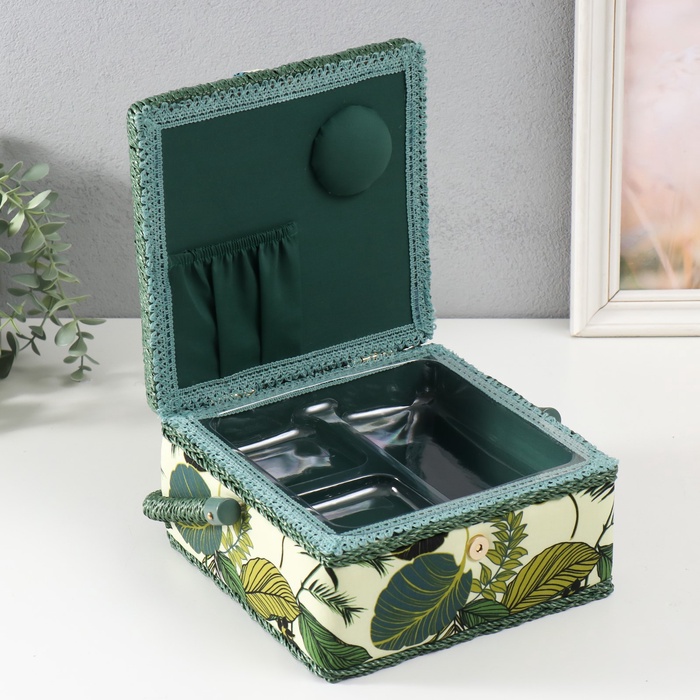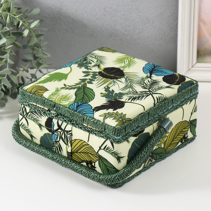 Шкатулка для рукоделия и шитья «Тропические листья на зелёном», хранение ниток, иголок, мелочи, 20×20×11 см 7 фото