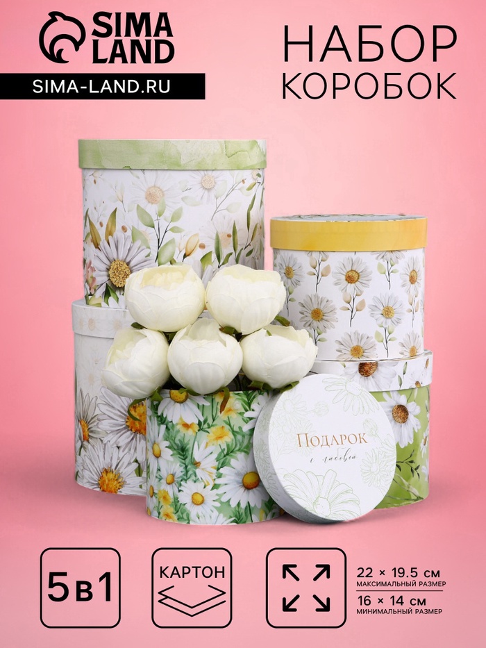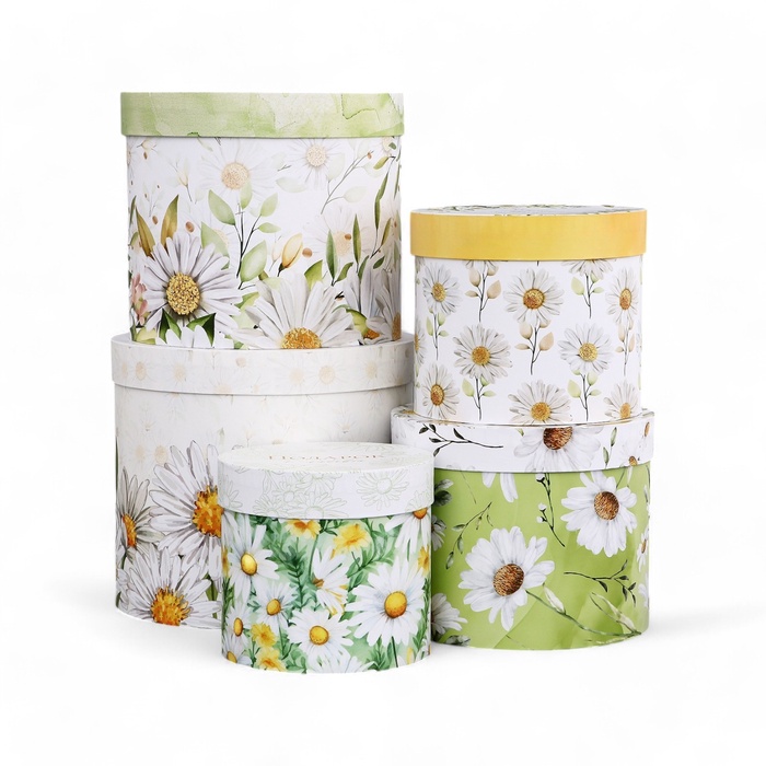 Набор шляпных коробок для цветов 5 в 1, упаковка подарочная, «Ромашки», 16×14 см - 22×19.5 см 10 фото