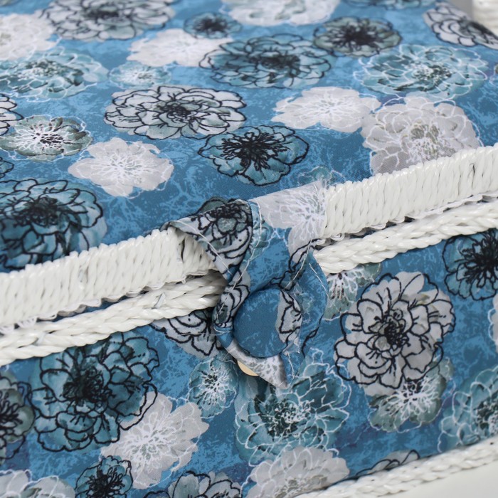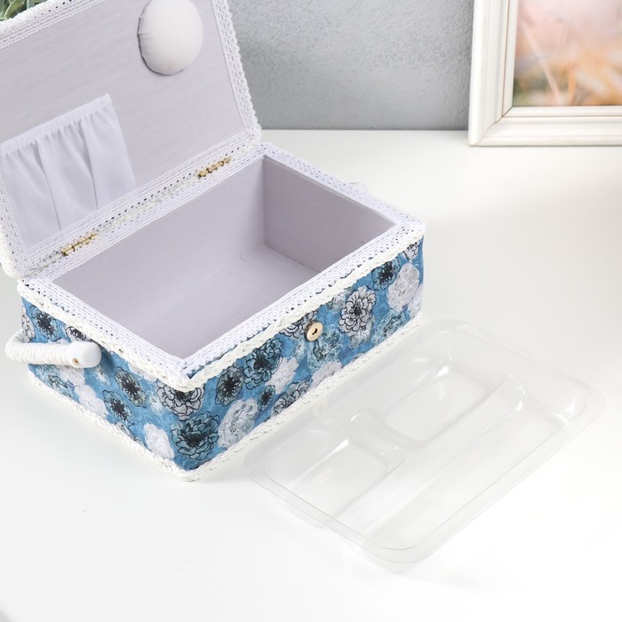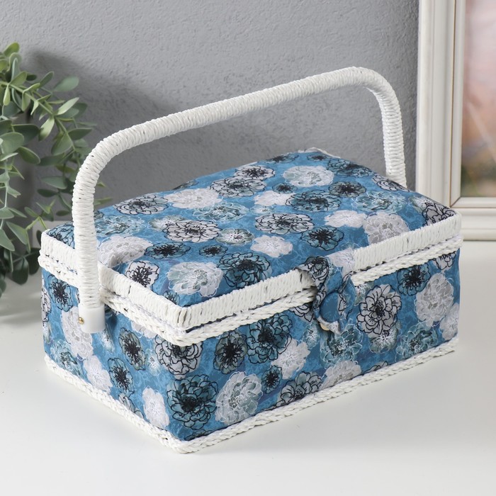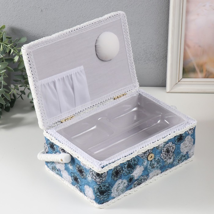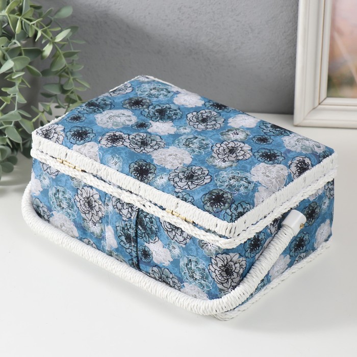 Шкатулка для рукоделия и шитья «Чёрно-белые цветы на голубом», хранение ниток, иголок, мелочи, 24×16×11 см 5 фото