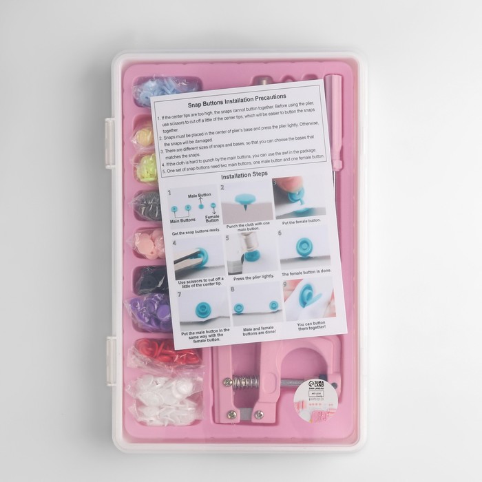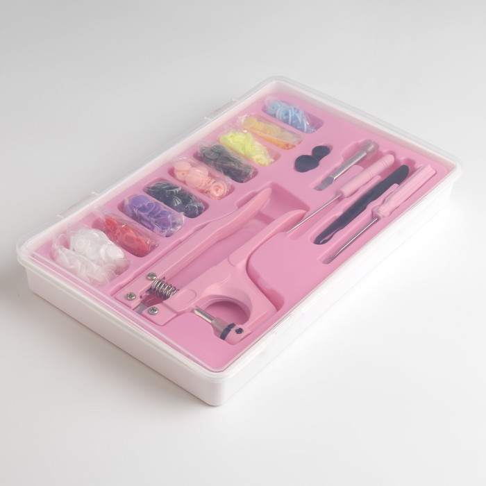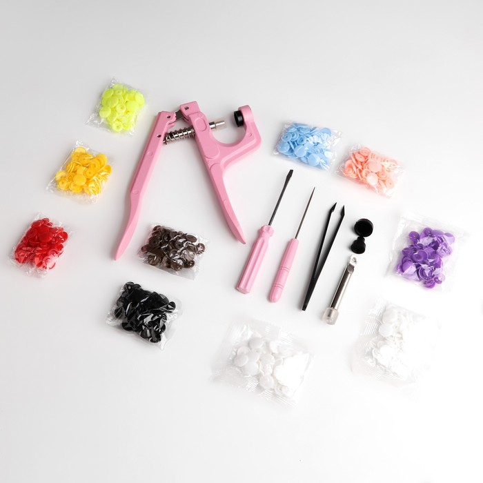 Набор для установки пластиковых кнопок: кнопки, d=13 мм, 100 шт., щипцы, шило, отвёртка, пинцет, в органайзере 7 фото