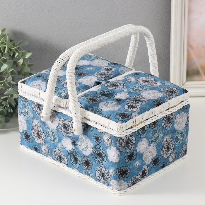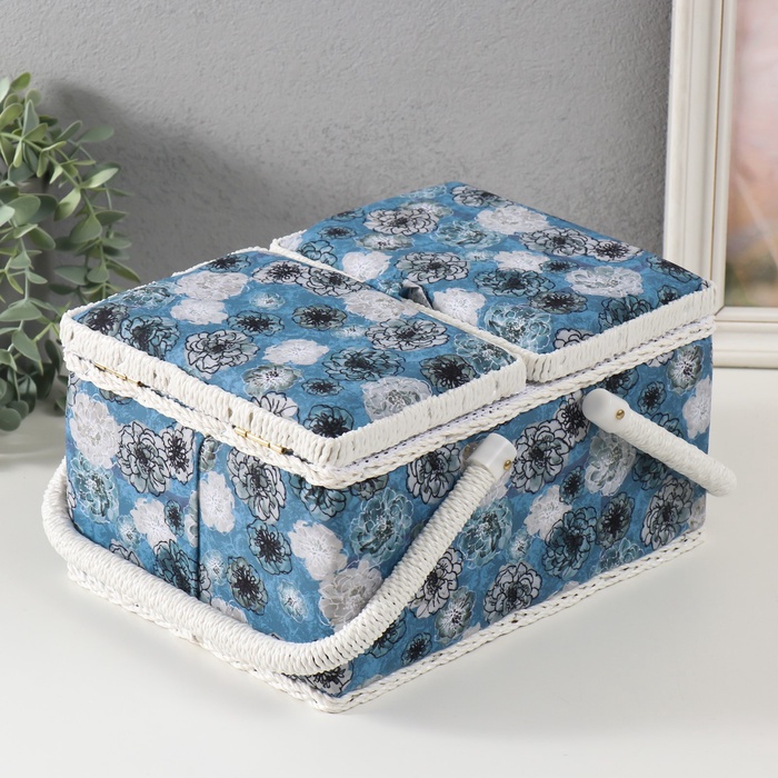 Шкатулка для рукоделия и шитья «Голубые цветы на синем», хранение ниток, иголок, мелочи, 24×16×11 см 7 фото
