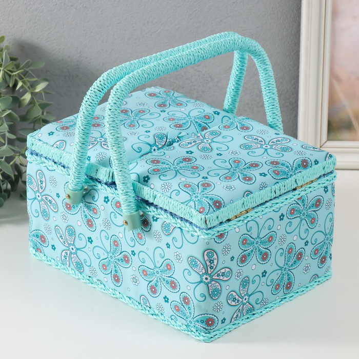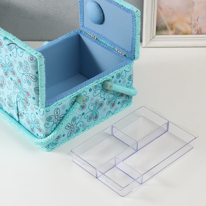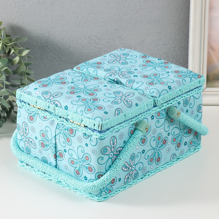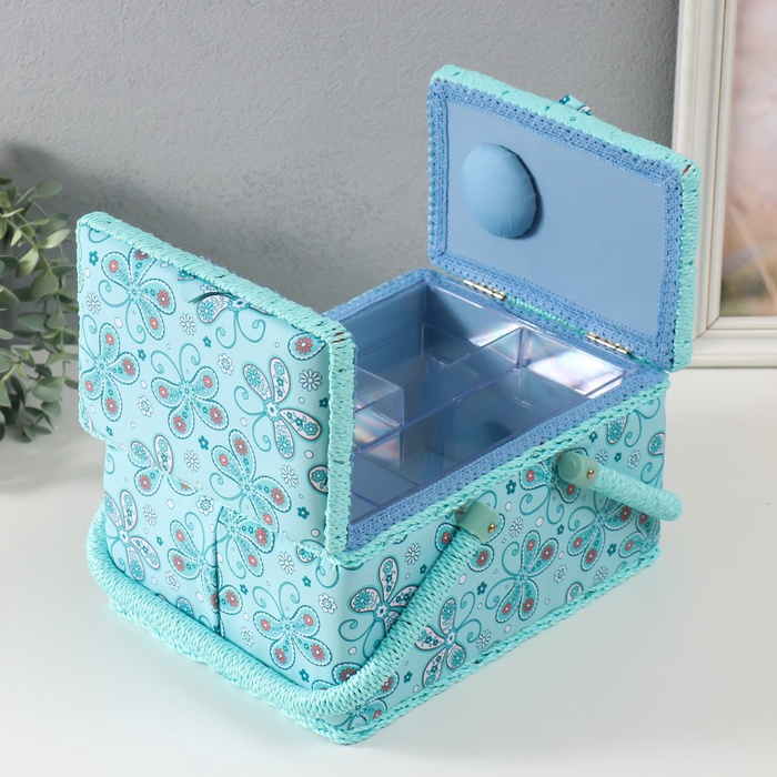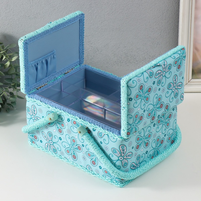 Шкатулка для рукоделия и шитья «Бабочки и цветочки на голубом», хранение ниток, иголок, мелочи, 19×26×14.5 см 7 фото